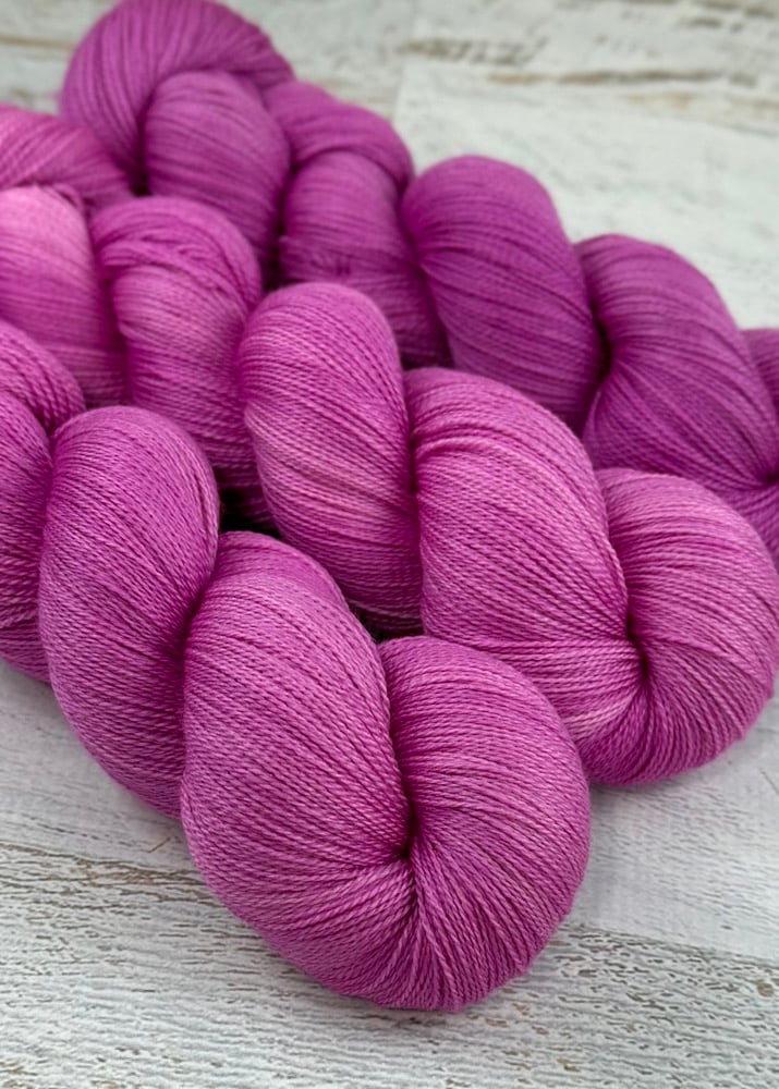 Pretty in pink. One skein is more saturated than the other two skeins. If you have a preference on which skein(s) you like let me a note during the checkout process. The 25% silk in these skeins give them such a beautiful sheen.