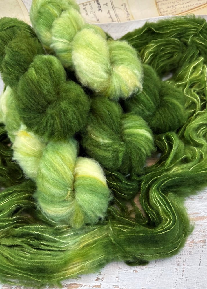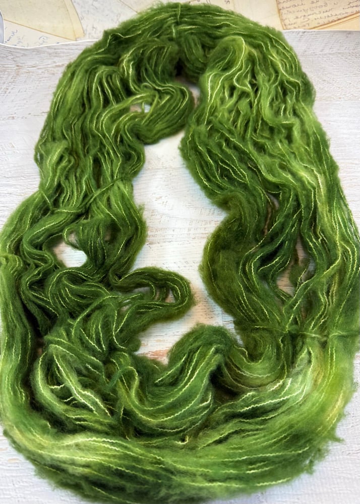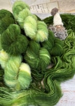They're back! These skeins are SOOOO fluffy I keep giggling everytime I touch them. They are extremely soft and every touch is like a dopamine hit of pure joy. They are happiness in yarn from. There are 4 dark skeins and 2 light skeins available. Because this base is new to me I have been experimenting how to dye these fluffy babies and each dye bath ended up with 1 light skein. I think they look cool so I decided not to dye them more/again.