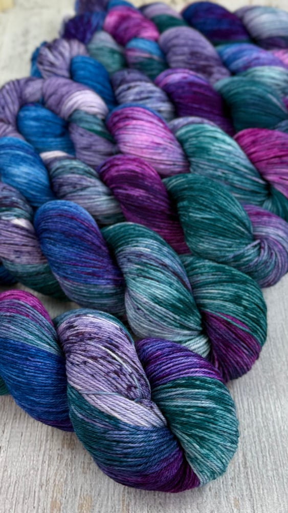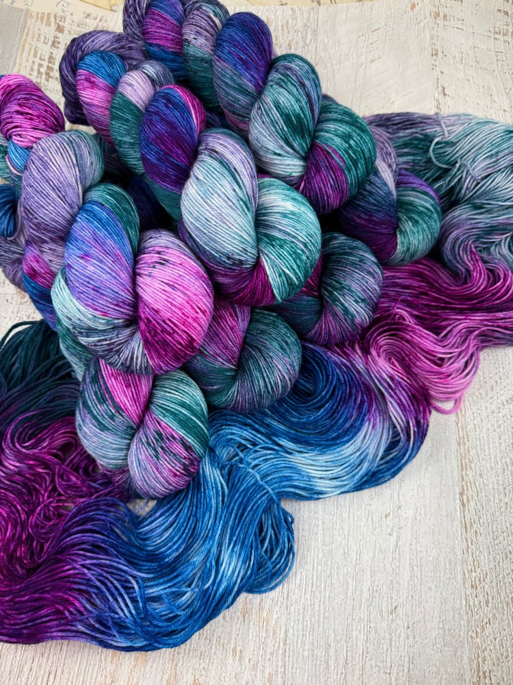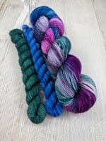 Bejeweled pairs perfectly with mini skeins Sapphire Blue, and Spruce skeins in the Mini Mania listing.