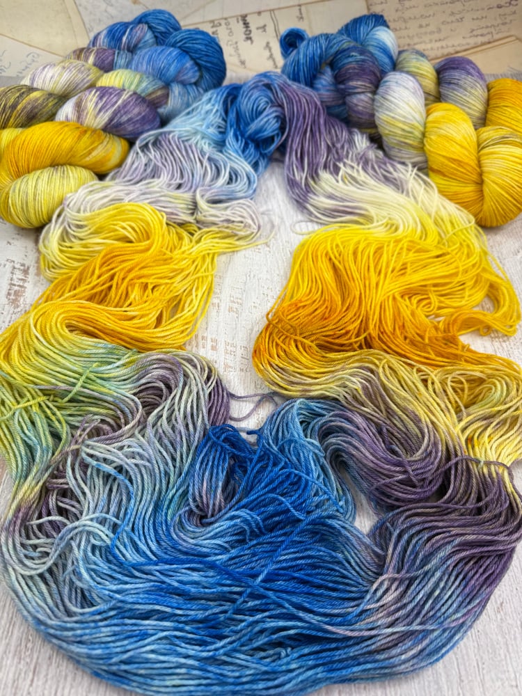 Colors: blue sapphire, lilac purple, yellow, white