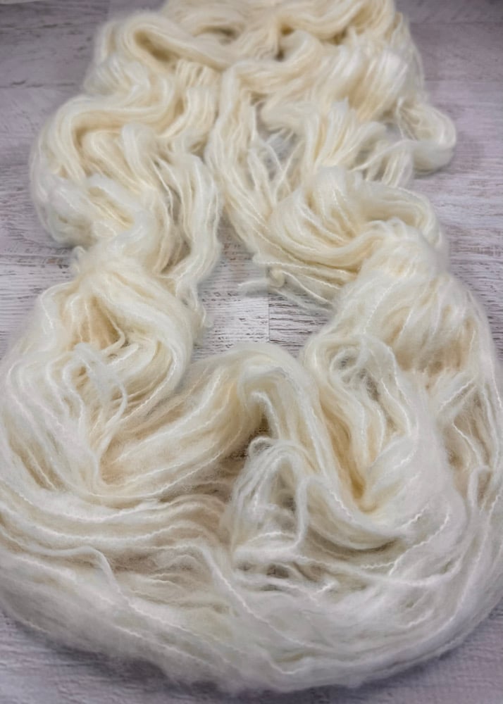They're back! These skeins are SOOOO fluffy I keep giggling everytime I touch them. They are extremely soft and every touch is like a dopamine hit of pure joy. They are happiness in yarn from. These skeins have not been dyed or placed in water - trust me when I tell you they will really bloom and become even more fluffy after they have been wetted and dried.