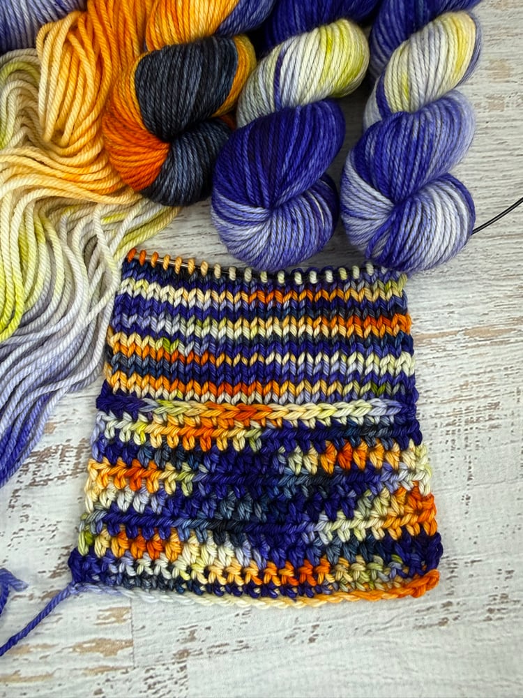 Inspired by scenes from the REMARKABLE movie Project Hail Mary. Don't miss the crochet and knit swatch in the third photo. This is a bold, fun colorway.