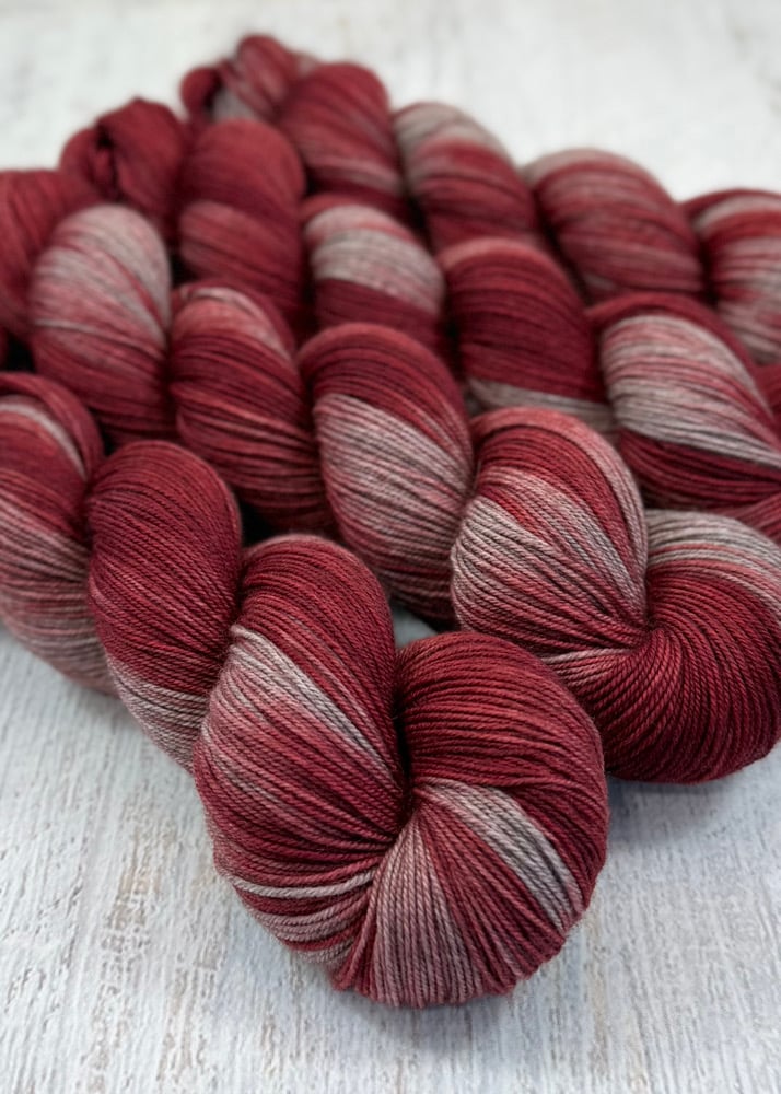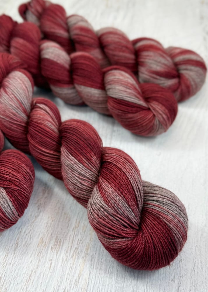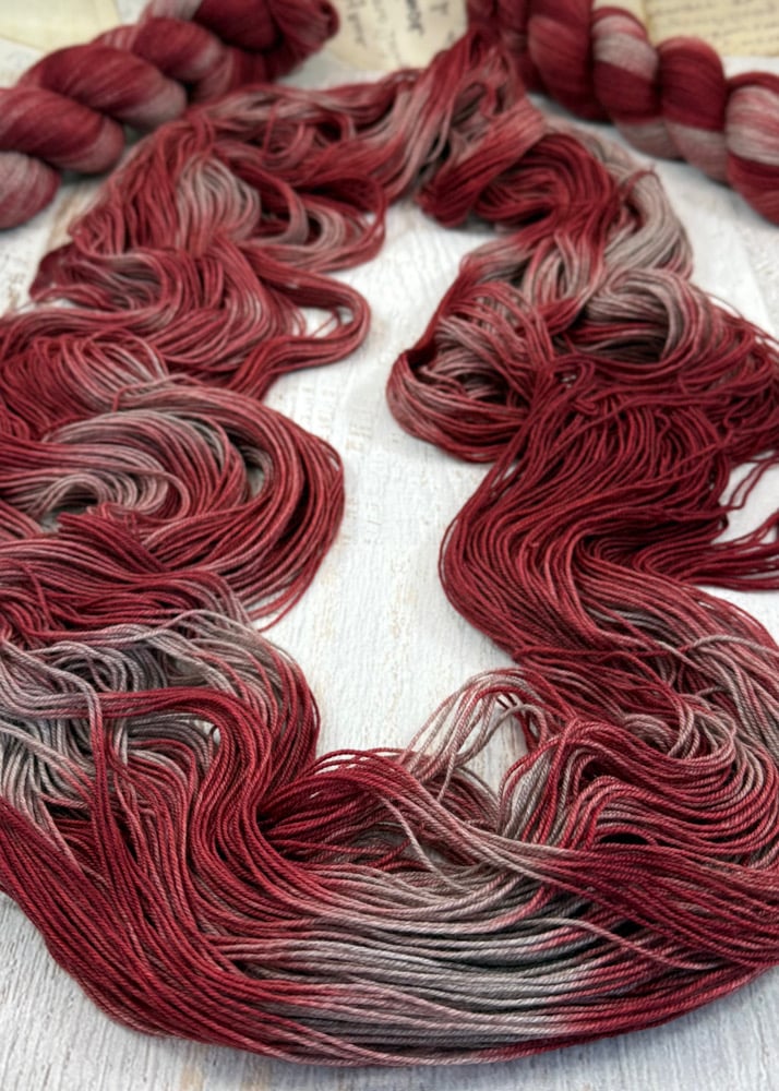 I wanted to add a luxury sock base to my shop that wasn't too expensive but still very nice. These skeins are merino/yak/nylon, and they are A DREAM! They are naturally a light gray color, so they dye differently than a white/cream base--and I like it. I also love that they could be used with my Tabitha sock base yarn in the same project without an issue.